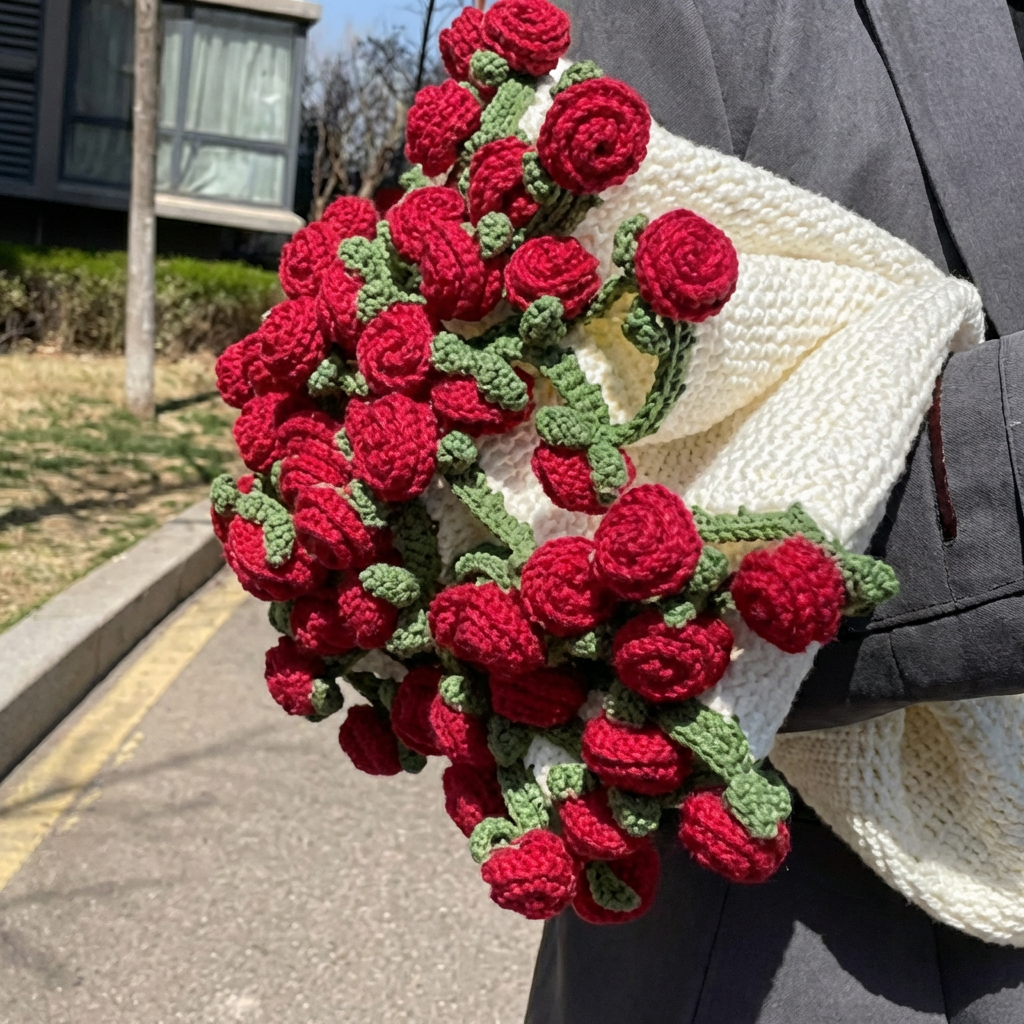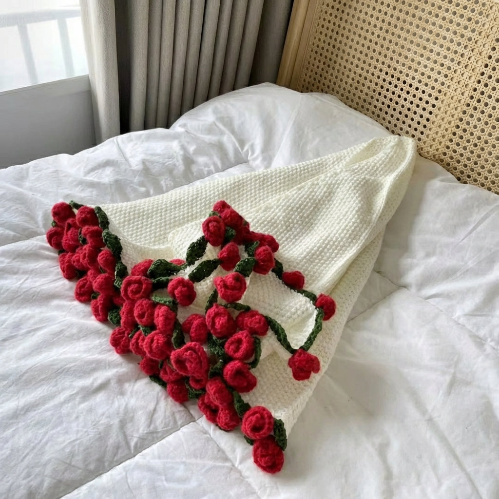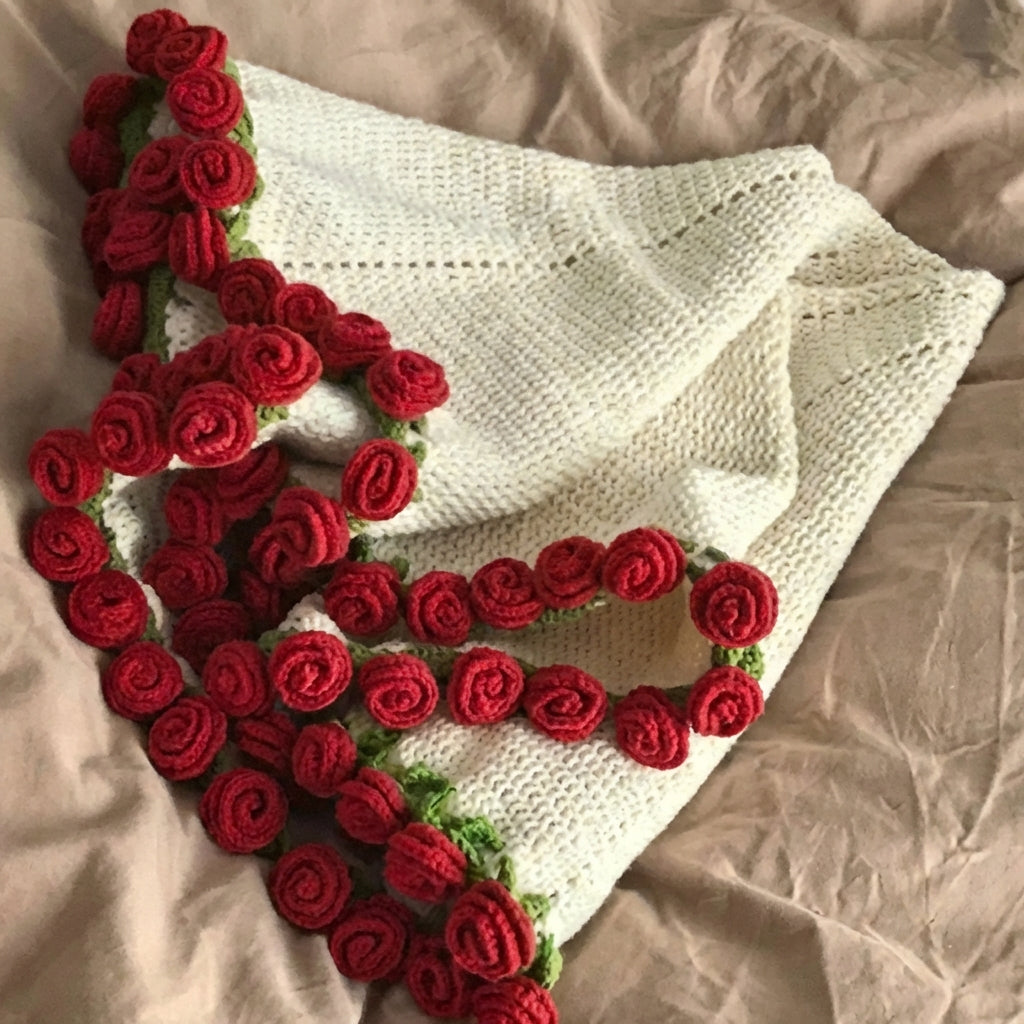 Minden rózsa kézzel horgolt, így a takaró stílusos dekorációvá válik, amely magára vonzza a figyelmet és romantikus hangulatot teremt.